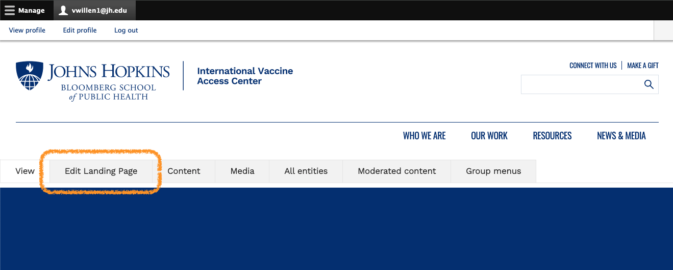 If your site is in a subdirectory of PublicHealth.JHU.edu, e.g., PublicHealth.JHU.edu/IVAC, log in, then go to your homepage and look for the "Edit Landing Page" button near the top. This will take you to a typical content editor, where you can add or modify your content.