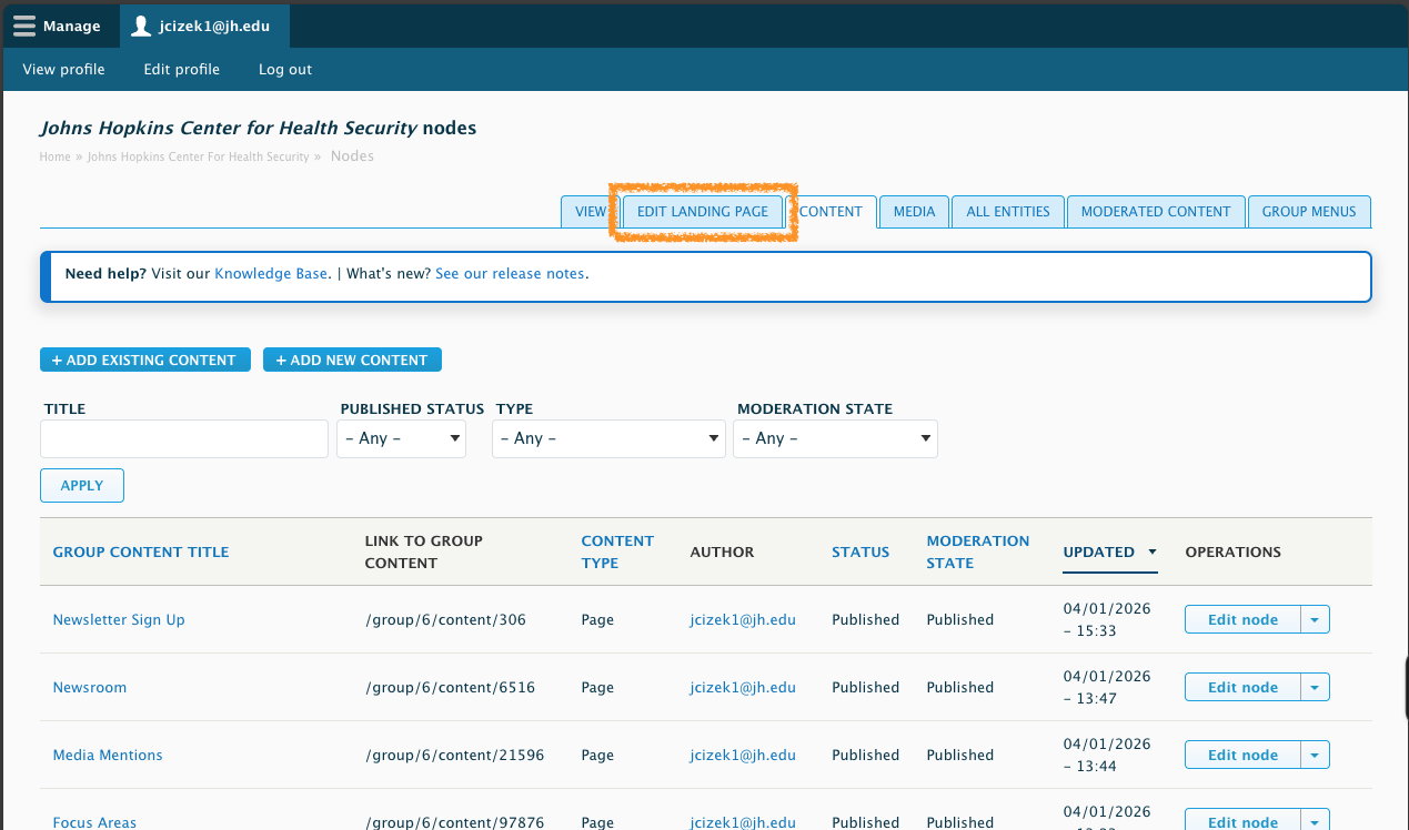 Instead, log in and go to the content section of the group you want to work with, then look for the "Edit Landing Page" link at the top of the page.