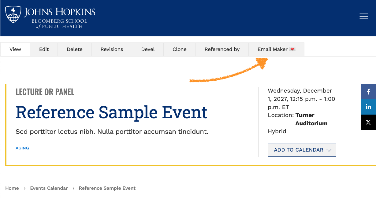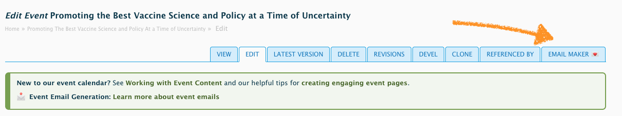 If you don't see the email maker tab in either location, then you may not have permission to edit that event. - Review to confirm the content looks as expected.